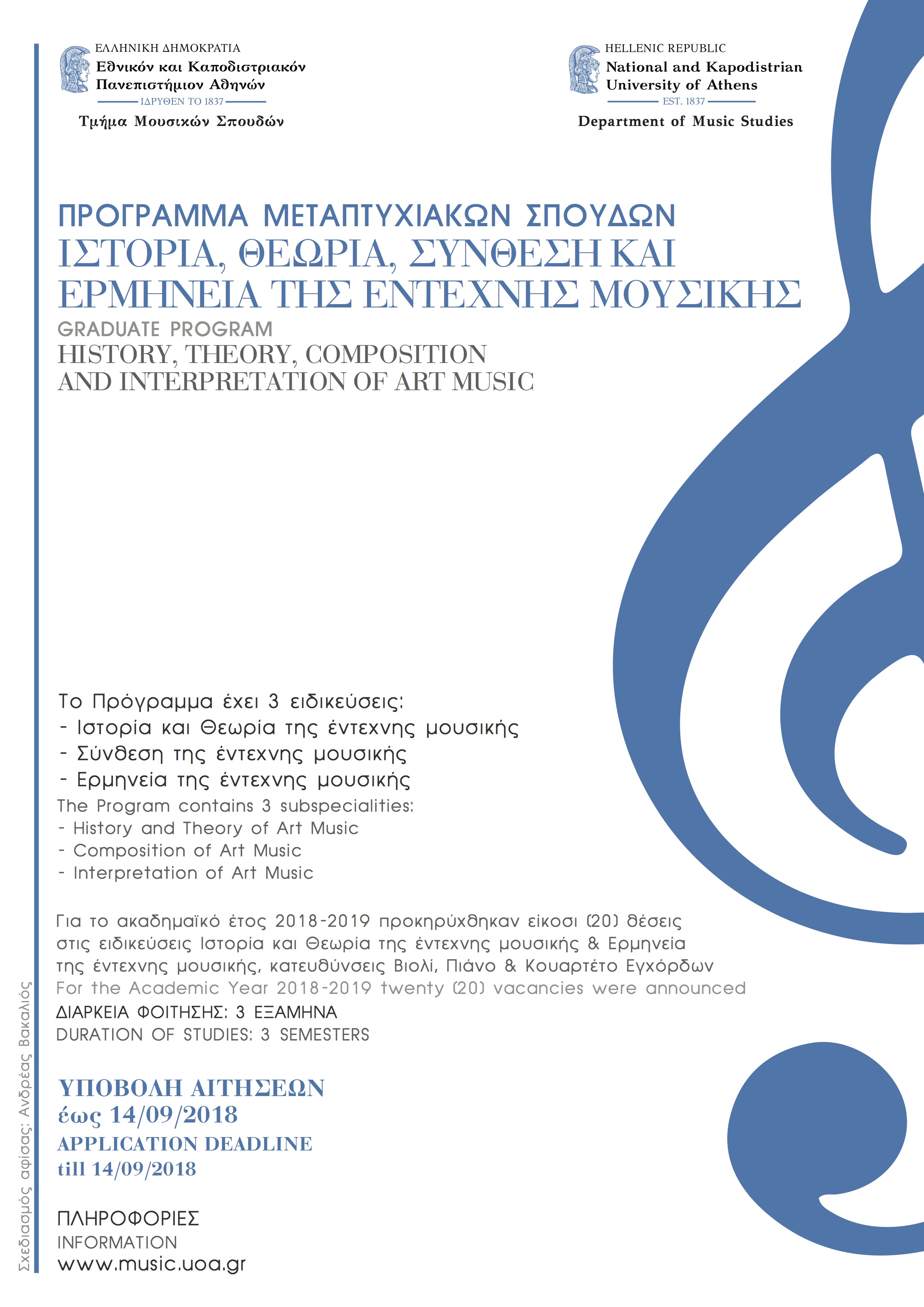Οι ενδιαφερόµενοι/ες, καλούνται να υποβάλουν φάκελο υποψηφιότητας από τη Δευτέρα 18/06/2018 έως και την Παρασκευή 14/09/2018 στη Γραμματεία του Τμήματος ή ταχυδρομικά με συστημένη αποστολή και με ημερομηνία ταχυδρομικής σφραγίδας έως και την 14/09/2018 στη διεύθυνση: Πανεπιστήμιο Αθηνών-Γραμματεία Τμήματος Μουσικών Σπουδών, Φιλοσοφική Σχολή, 3ος όροφος, Πανεπιστημιόπολη Ζωγράφου (υπόψη κου Νικολάου Φλεριανού) Τ.Κ. 157 84, Αθήνα. Δικαίωμα υποβολής αίτησης έχουν όσοι έλαβαν το πτυχίο τους ή αποδεδειγμένα περάτωσαν τις σπουδές τους μέχρι τον Αύγουστο του 2018. Οι υποψήφιοι που έχουν ολοκληρώσει τον κύκλο σπουδών και εκκρεμεί μόνο η ορκωμοσία για τη λήψη του πτυχίου πρέπει να καταθέσουν σχετική βεβαίωση του Τμήματος συνοδευόμενη από αναλυτική βαθμολογία και βαθμό πτυχίου.