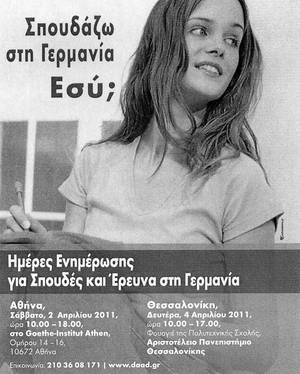 Η DAAD διοργανώνει σε συνεργασια με τη Γερμανική Πρεσβεία Αθηνών, το Γερμανικό Προξενείο στη Θεσσαλονίκη, το Αριστοτέλιο Πανεπιστήμιο και το Ινστιτούτο Goethe Αθηνών "Ημέρες Ενημέρωσης για Σπουδές και Έρευνα στη Γερμανία".