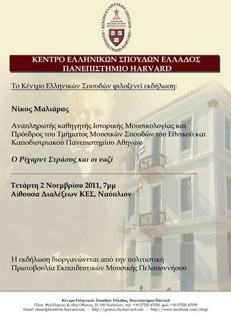 Το Κέντρο Ελληνικών Σπουδών του Πανεπιστημίου Harvard στο Ναύπλιον θα φιλοξενήσει εκδήλωση, η οποία θα πραγματοποιηθεί την Τετάρτη 2 Νοεμβρίου 2011 και ώρα 19.00 στην αίθουσα διαλέξεων «Οικογενείας Νίκου Μαζαράκη», κατά την οποία θα μιλήσει ο κύριος Νίκος Μαλιάρας, Αναπληρωτής Καθηγητής Ιστορικής Μουσικολογίας και Πρόεδρος του Τμήματος Μουσικών Σπουδών του Πανεπιστημίου Αθηνών.